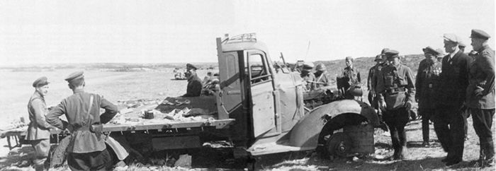 Командный состав штаба 1-й армейской группы, посол Советского Союза в Монголии И. А. Иванов (в костюме и кепке) и главнокомандующий МНРА маршал МНР Х. Чойболсан (слева от Иванова) осматривают разбитый автомобиль Ford V8 американского производства. Сентябрь 1939 года (АСКМ).
