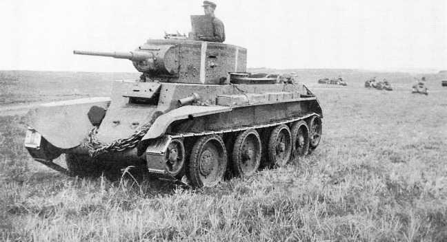 Танки БТ-7 6-й танковой бригады выходят на рубеж атаки. Две белых полосы, нанесенных поперек башни, служили для опознавания боевых машин своей авиацией. Август 1939 года (АСКМ).