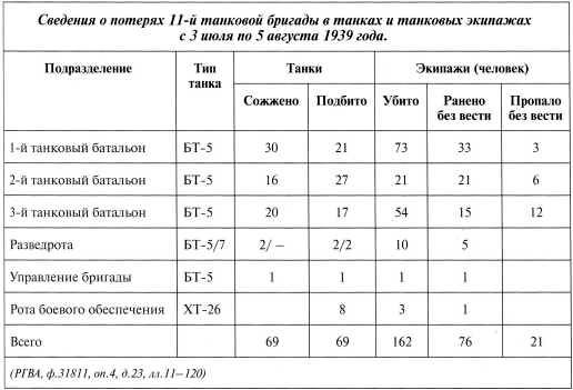 Основная тяжесть боев выпала на 11-ю танковую бригаду, которая понесла колоссальные потери: из 133 танков, участвовавших в бою 3 июля на западном берегу (1-й танковый батальон – 44 БТ-5, 2-й танковый батальон – 28 БТ-5, 3-й танковый батальон – 50 БТ-5, рота боевого обеспечения – 10 ХТ-26, разведывательная рота – 5 БТ-5) было потеряно 77 машин (1-й танковый батальон – 20 БТ-5, 2-й танковый батальон – 17 БТ-5, 3-й танковый батальон – 34 БТ-5, рота боевого обеспечения – 5 ХТ-26, разведывательная рота – 1 БТ-5). Кроме того, было потеряно 37 бронемашин из 59 (не считая монгольских бронедивизионов, потерявших 8 машин).