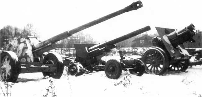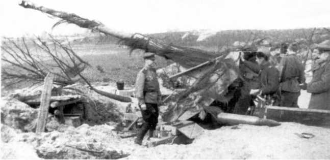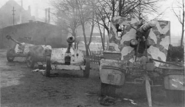 Трофеи советских войск в Восточной Пруссии – справа 88-мм зенитка Flak 36, слева три 75-мм противотанковых орудия Pak 40. Февраль 1945 года (РГАКФД).
