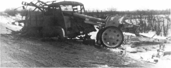 Брошенное в районе Ропши 88-мм противотанковое орудие Pak 43/41. Ленинградский фронт, 24 января 1944 года. Рядом с пушкой разбитый грузовик «Рено» (АСКМ).