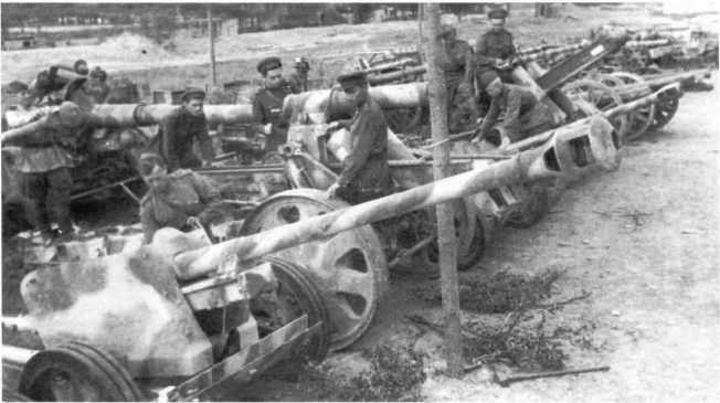 Немецкие орудия, захваченные в районе реки Прут. 2-й Украинский фронт, 1944 год. На переднем плане 75-мм противотанковая пушка Pak 40 (АСКМ).