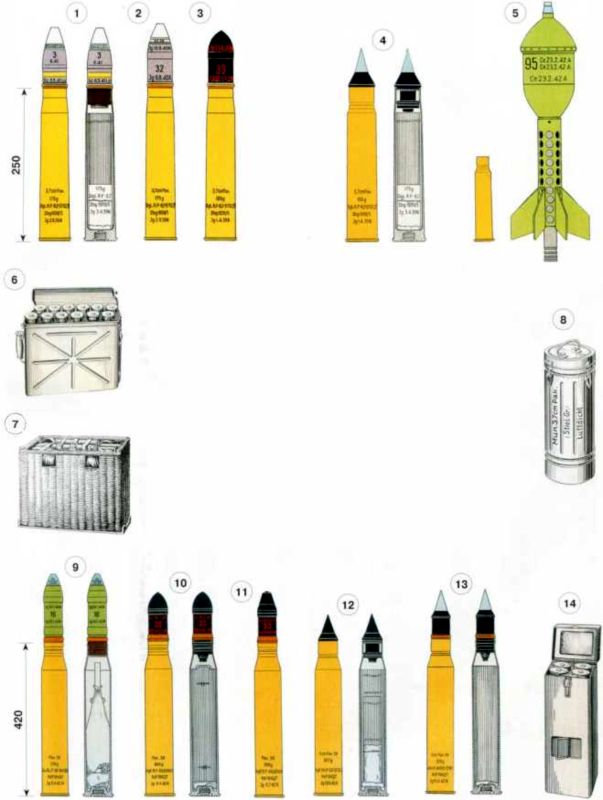 Выстрелы к 50-мм противотанковой пушке Pak 38: 9 – с осколочной гранатой SprGr 38; 10 – с бронебойно-трассирующим снарядом PzGr; 11 – с бронебойно-трассирующим снарядом PzGr 39; 12 – с бронебойно-трассирующим подкалиберным снарядом PzGr 40; 13 – с бронебойно-трассирующим подкалиберным снарядом PzGr 40/1; 14 – металлический ящик для 4 выстрелов к 50-мм противотанковой пушке Pak 38.