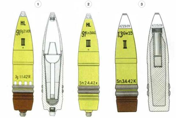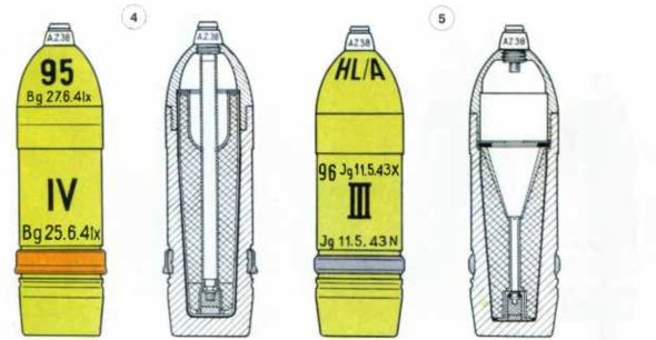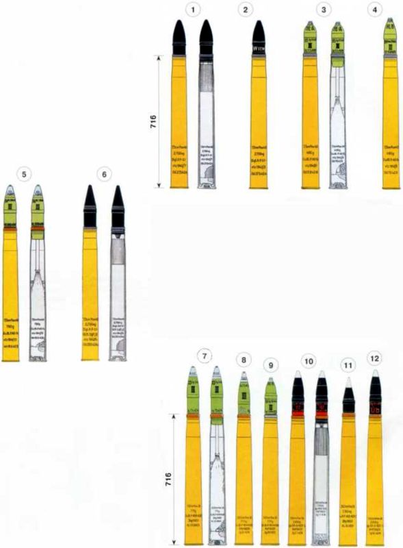 Выстрелы к 76,2-мм противотанковым пушкам Pak 36 (r) и Pak 39 (r): 7 – с осколочной трассирующей гранатой SprGr 39; 8 – с практическим осколочным трассирующим снарядом SprGr 39 Ub; 9 – с кумулятивным трассирующим снарядом 38 HL/B; 10 – с бронебойно-трассирующим снарядом PzGr 39; 11 – с бронебойно-трассирующим подкалиберным снарядом PzGr 40; 12 – с практическим бронебойно-трассирующим снарядом PzGr 39 rot Ub.