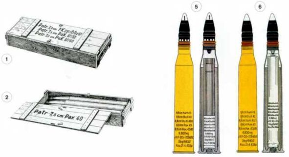 1 – деревянный ящик для 3 выстрелов к 75-мм противотанковой пушке Pak 97/38; 2 – деревянный ящик для 3 выстрелов к 75-мм противотанковой пушке Pak 40; 3 – металлический футляр для одного выстрела к 76,2-мм противотанковым пушкам Pak 36 (r) и Pak 39 (r); 4 – металлический футляр для одного выстрела к 75-мм противотанковой пушке Pak 40.