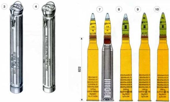 Выстрелы к 88-мм противотанковым пушкам Pak 43 и Pak 43/41: 5 – с бронебойно-трассирующим снарядом PzGr 39-1; 6 – с бронебойно-трассирующим снарядом PzGr 39/43; 7 – с осколочной гранатой SprGr Flak 41 (старого образца); 8 – с осколочной гранатой SprGr43; 9 – с кумулятивным снарядом 39 HL; 10 – с кумулятивным снарядом 39/43 HL.