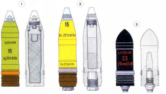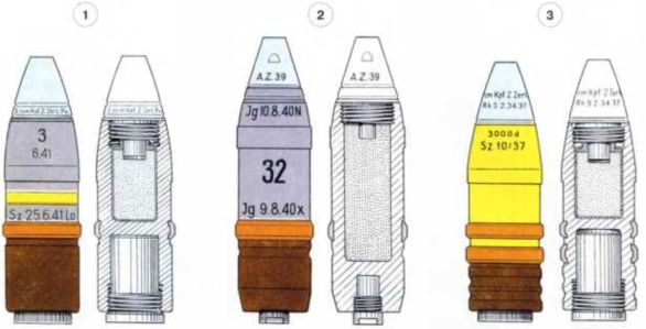 Выстрелы к 75-мм противотанковой пушке Pak 40: 1 – с бронебойно-трассирующим снарядом PzGr 40; 2 – с бронебойно-трассирующим снарядом PzGr40W; 3 – с кумулятивным снарядом 38 Н1/А; 4 – с кумулятивным снарядом 38 HL/B; 5 – с осколочной гранатой SprGr34; 6 – с бронебойно-трассирующим снарядом PzGr 39.