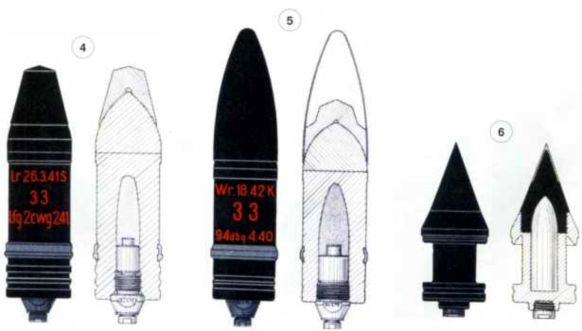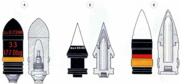 Снаряды для 37-мм противотанковой пушке Pak 35/36: 1 – осколочно-трассирующая граната SprGr 18 umg (обр. 18 модернизированная); 2 – осколочно-трассирующая граната SprGr40; 3 – осколочно-трассирующая граната SprGr 18; 4 – бронебойно-трассирующий снаряд PzGr; 5 – бронебойно-трассирующий подкалиберный снаряд PzGr 40; 6 – бронебойно-трассирующий подкалиберный снаряд другого варианта.