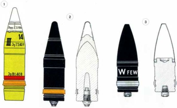 Снаряды для 75-мм противотанковой пушке Pak 40: 1 – осколочная граната SprGr 34; 2 – бронебойно-трассирующий снаряд PzGr39; 3 – бронебойно-трассирующий снаряд PzGr 40W; 4 – кумулятивный снаряд 38 Н; 5 – кумулятивный снаряд 38 Н1/А.