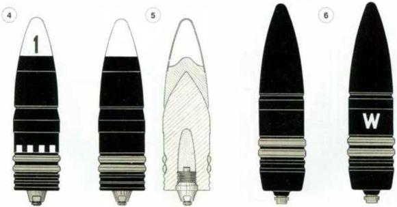 Снаряды для 88-мм противотанковых пушек Pak 43 и Pak 4/41: 1 – кумулятивный снаряд 39 HL; 2 – кумулятивный снаряд 39/43 HL; 3 – осколочная граната SprGr43; 4 – бронебойно-трассирующий снаряд PzGr 39-1; 5 – бронебойно-трассирующий снаряд PzGr 39/43; 6 – бронебойно-подкалиберный снаряд PzGr 40/43.