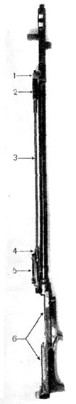 Ствол со ствольной коробкой: 1 – газовая камора; 2 – газовый цилиндр; 3 – шток; 4 – толкатель; 5 – прицел; 6 – ствольная коробка.
