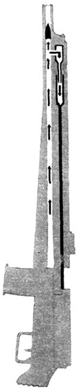 Из отверстия они попадают в небольшую стальную коробочку, укрепленную снаружи ствола. Это газовая камора. Как же отсюда выбраться? Единственный выход ведет не вперед, а назад. Делать нечего, буйный поток поворачивается и попадает в короткую трубку – газовый патрубок.