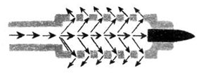 А удается ей это потому, что порядочное количество энергии пороховых газов, попавших в тормоз, тратится попусту. Часть газов проскакивает вслед за пулей, часть свободно проходит через окошки.