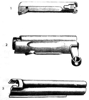 1 – остов затвора; в нем помещаются ударник и выбрасыватель; 2 – стебель затвора; 3 – эта крышка соединяет затвор со ствольной коробкой.