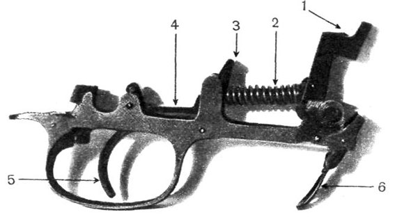 Ударно-пусковой механизм: 1 – курок; 2 – направляющий стержень с боевой пружиной; 3 – коромысло; 4 – спусковая тяга; 5 – спусковой крючок; 6 – защелка магазина.