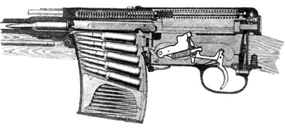 Бойцу уже не надо после каждого выстрела отодвигать рукой затвор. Он только вставляет новый магазин, целится и нажимает на спуск. А вся забота о заряжении входит в обязанности винтовки. Потому-то она и называется самозарядной.
