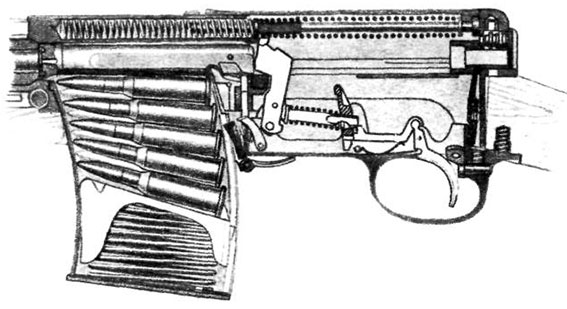 Только этого и ждет подаватель магазина. Он давно уже настороже, ибо снизу на него давит пружина. Едва освободилось место в ствольной коробке, как он уже подает в окно новый патрон.