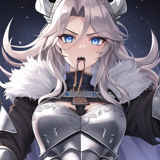 Седая, на голове шлем из стали с острыми рогами, куски раскрытого забрала прячутся среди пышных волос, из-за чего кажется, что шлем защищает только макушку. Нагрудник из того же металла, кожаные пластины под основной броней, наплечники, едва заметные механизмы под защитой предплечий, латная юбка, укороченная спереди до середины бедер, но тянущаяся до земли сзади, плотные черные колготки и плащ с вырезом на спине, чтобы было видно юбку. Ветер треплет белый медвежий мех на воротнике.