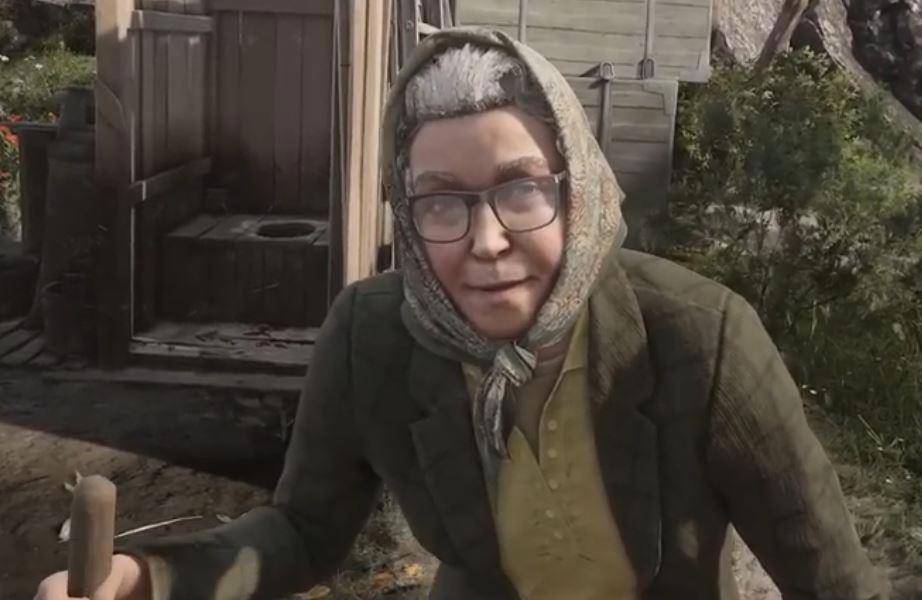 О! Пожилая леди, не так давно строившая Вовчиков на берегу реки, стоит наклонившись надомной с вилами в руках. Тот же старый пиджачок, головной платок, очки в толстой оправе, пряди седых волос выглядывающие из под платка.