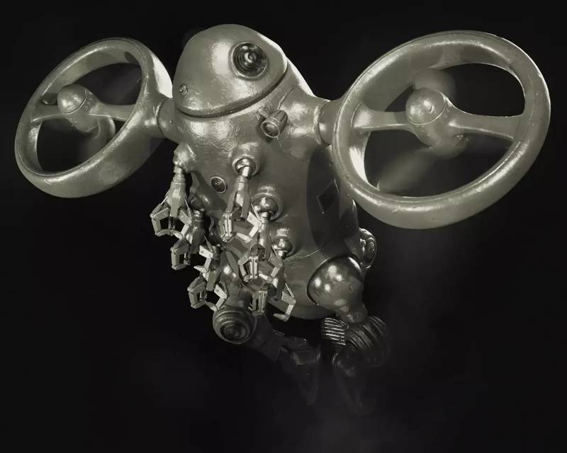Рука уже потянулась к верньеру радиоприемника, как со свистом и гулом турбин, к машине подлетел здоровущий э… робот? Толстая, металлическая сарделька, на одном конце которой вращались визоры, похожие на вытаращенные глаза, вместо рук были две турбины в защитных кольцах торчащие по бокам и три мощных ноги снизу, а из цилиндрического тела торчали шесть захватов. В общем вся эта конструкция, до неприличия на поминала летающую свинью, зачем-то покрашенную в тёмно-серый цвет.