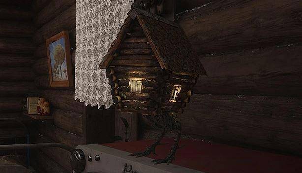 Зависнувшая на высоте метра, избушка выпустила посадочные опоры, со звонким звуком откинулась складная лестница, на которой, тынь, тынь, тынь появились ступеньки и резные перила.