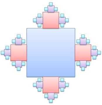 И я нашел ответ в математике. Есть такое понятие в ней, называется фрактал. Но фрактал все же штука бесконечная и для наших задач не сильно подходит. Мы будем использовать предфракталы – это фракталы с ограниченным количеством итераций. Если говорить про фракталы, то это математическое множество, обладающее свойствами самоподобия. Вот вам пример математического самоподобия. Возле вас на столах лежат кочаны капусты Романеско, возьмите в руки и осмотрите ее грани, потом передайте соседям. Да, спасибо. Как видите, фракталы для математиков это хороший способ описать геометрии природы. Ими можно описать облака, горы, капусту, кровеносную систему человека. Почти вся природная математика систем им подчиняется. Но они все же очень сложные и нам нужны более простые вещи. Потому мы воспользуемся геометрическими предфракталами. Мы будем использовать квадрат. Как относительно простую фигуру для расчетов и рисования. Можно и треугольники взять, а можно окружность. Фракталы обладают самоподобием и могут расти как внутрь себя, так и внешне от своей первой фигуры.