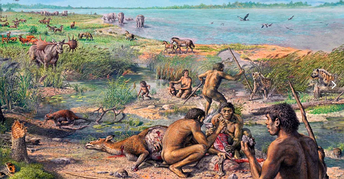 Внизу, у подножия холма, расположилась стоянка первобытных людей. В том, что это люди, а не полу-обезьяны, сомнений не было. Хоть они и были совсем голые, но шерсти на теле не наблюдалось. Да и лица, пусть и невероятно грубых черт, тем не менее были далеки от обезьяньих морд.