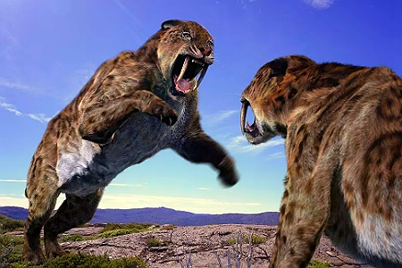 Две громадные саблезубые кошки, каждая весом под 5–6 центнеров выясняли отношения. Что они не поделили – тайна, покрытая мраком. Самцы это или самки – понять невозможно.