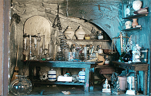 Повсюду – на столе, полках и даже на полу, виднелись керамические и стеклянные резервуары-сосуды для приемки использованных веществ, приспособления для дистилляции. Рядом с печью лежали щипцы, кочерга и молотки, а также меха для раздувания огня. Особое место занимал перегонный куб. Это – основа основ для работы алхимика.