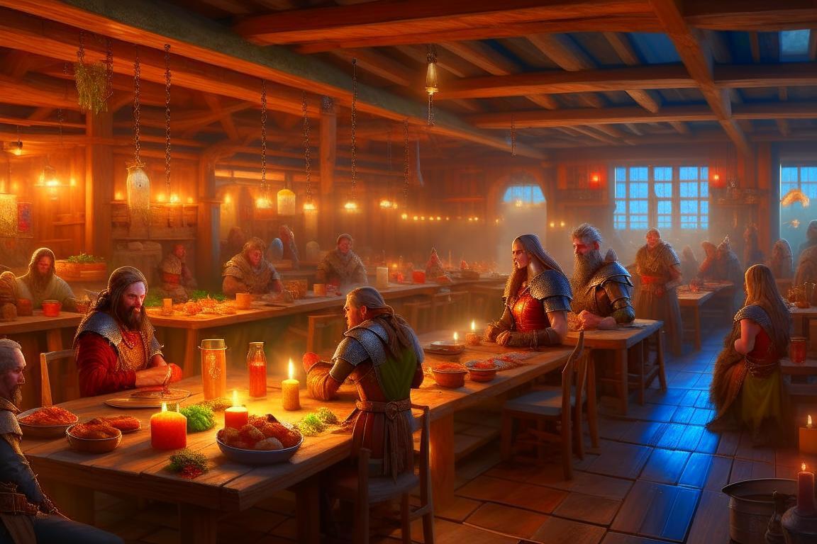 Пир шёл своим чередом мы много пили, сначала за хозяева, потом за его сыновей, потом за каждого по отдельности, потом за славных гостей, потом выпили за богов, а после снова за хозяина. Столы ломились от самой разнообразной еды, чего тут только не было, рыба соленая, рыба запечённая, рыба жаренная, огромное количество всевозможного мяса: кабан, свинья, зайцы, даже телёнок был целиком зажарен на вертеле, про разнообразие птицы я вообще молчу.