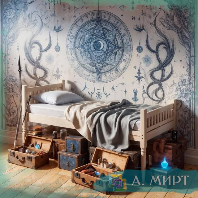Вдобавок к этой настенной живописи из-под кроватей выглядывали чемоданы и деревянные ящики, большей частью приоткрытые: в одном из них я разглядел кучу каких-то сушёных трав, от них и запах шёл соответственный, в ещё одном лежало несколько пустых флаконов и другая стеклянная посуда непонятного мне назначения, а из ближайшего торчала погнутая рукоятка кинжала с поблекшим камнем огня. Всё это, хоть и находилось в беспорядке, всё же имело какой-то свой принцип расположения в комнате.