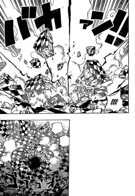 Из-за состава руки я закономерно прилипаю, а он раскручивает и вмазывает меня в землю, оставляя огромный кратер, точь-в-точь как он когда-то в будущем приложит Луффи.