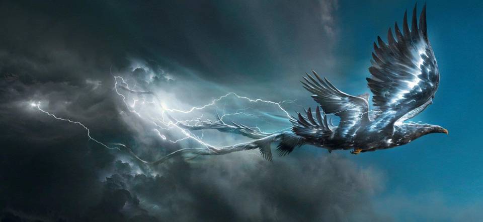 Заметив моё появление, он преобразился в огромную чёрную птицу с четырьмя когтистыми лапами, одну из которых сложно назвать лапой, пятью парами огромных крыльев, размах которых сложно определить на глаз, и двумя длиннющими хвостами. Вновь ударил сильный ветер, чистое небо мигом затянулось тучами, в которых застрекотали молнии.