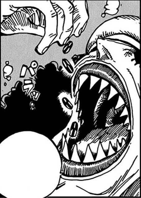 Это был внушительных размеров рыбочеловек-большая белая акула. У парня заметно выделялся живот с красной татуировкой справа, на которой был изображен перечёркнутый человек с отрубленной головой, а также длинный шрам слева. У него были красные глаза с длинными толстыми ресницами, острые треугольные зубы, сплющенный нос и длинные черные волосы.