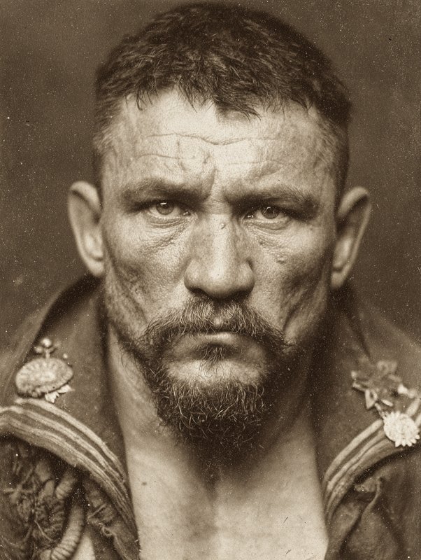 Моряк вздохнул и стал стаскивать рубаху. Подштанники у него и так были разрезаны, чтобы забинтовать ногу. Морщась и прихрамывая, он остался стоять голым в камере. На теле виднелись старые шрамы – видно, драться приходилось не раз. Мужик он был здоровый – крепкий детина, высокий, широкомордый, с лихими усами с загнутыми вверх кончиками и волнистыми волосами. На предплечье синела татуировка – якорь с цепью. Прямо гроза баб, подумал я.