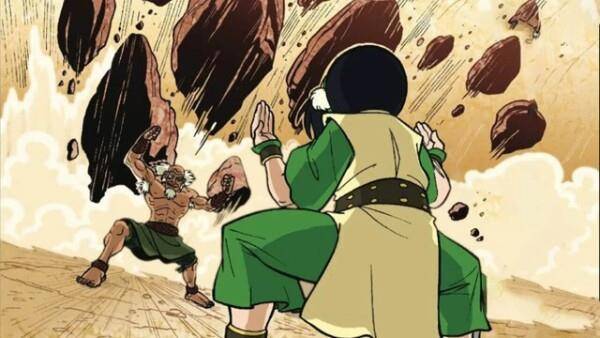 Но пускай её глаза ни на секунду не открывались, Тоф видела всё. Замахнувшись ладонью и ударив ей по земле, она вызвала мощную тряску. Такую, что сам дворец начал идти ходуном и пугать всех находящихся рядом людей. Буми, которой прятался под землёй и намеревался быстро схватить убегающего Аанга, просто вылетел оттуда и без своей на то воли оказался в воздухе.