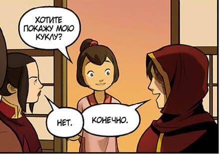 – Хотите покажу мою куклу? – где-то на фоне, младшая сестра Ту’Ли подошла к Азуле и Зуко и попыталась с ними подружиться. Нет, что самое ужасное – все его убийства были бессмысленны? Семья даже не получала денег, и их просто воровала местная стража? Все те люди из Шен Гуаня, которых он разорвал на части, сдохли просто так?