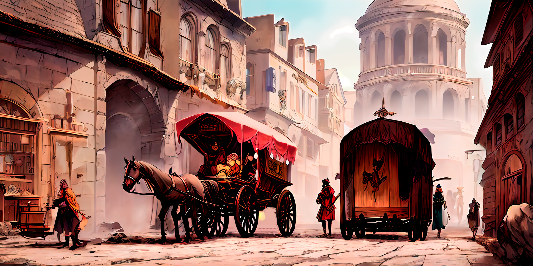 Пройдя несколько кварталов, я вышел на большую дорогу, по которой тоже шли провозки и люди, пусть и не в такой концентрации как на площади. Слева я увидел ещё одну площадь, где стояло множество прилавков. Скорее всего, это рынок, который меня пока не интересует. Позади рынка виднеются большие украшенные дома и замок, где, наверное, восседает местный лорд или даже король.