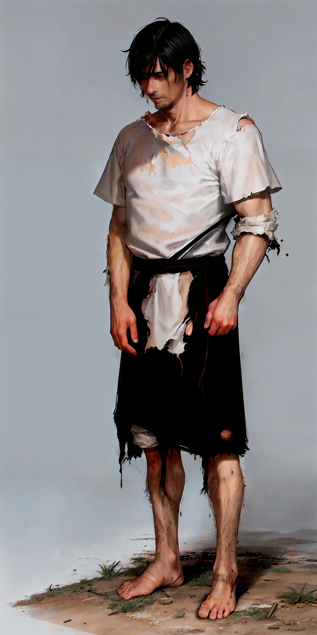 Я посмотрел на себя. На мне висит какая-то изодранная туника, покрытая пятнами и грязные на половину разорванные штаны, затянутые тряпкой. Даже на ногах ничего нет.