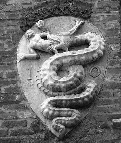Изображения василиска разные. Вот на этом каменном гербе из Милана, ставшим прототипом эмблемы альфа-Ромео – тоже василиск, как утверждают.