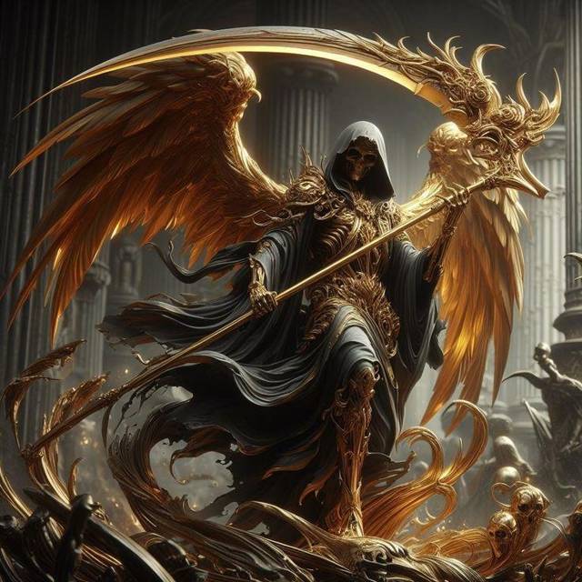 В следующий момент сверкнула ещё одна яркая вспышка, и влюблённая пара оказалась в достаточно просторном и светлом помещение, напротив огромного портрета. На нём была изображена женщина, точнее лич, с золотыми крыльями за спиной и с золотой косой в руках. Её кости так же были из золота, а её балахон эпично развивался на ветру. Сама же женщина ступала по пламени, в котором горели души смертных.
