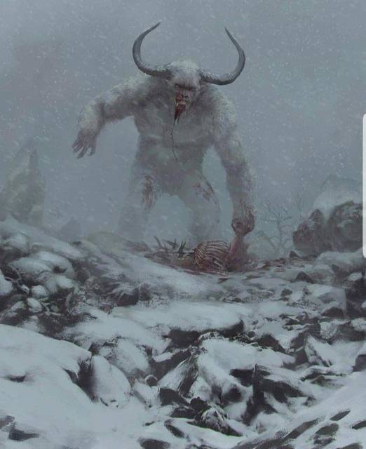 Обитателем ледяной пустыни была гигантская обезьяна с густой белой шерстью. На её руках когтей не было, а значит, в бою она вполне может использовать какое-то примитивное оружие. Голову обезьяны венчают острые рога, а это значит, что она вполне может забодать кого-нибудь насмерть.