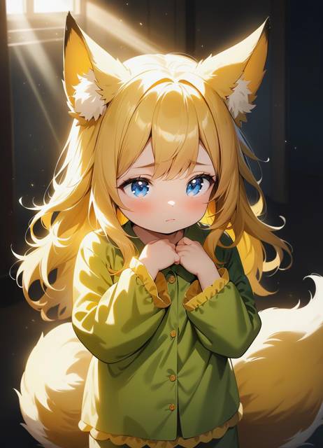 Первыми на глаза попались… ушки. Большие, пушистые, лисьи ушки ярко-жёлтого, жизнерадостно-пшеничного цвета. Затем я сконцентрировалась на длинных и столь же ярко-пшеничных волосах, теряющихся где-то в клубке из моих белоснежных хвостов, укутавших нас подобно облаку…