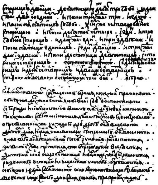 И паки десятое четыре <М> и един <А>, и трегубное сторицею <Т>, и дважды един <В>, и три з двема <Е>, и паки пятица единицею <Е>, и един двоицею <В>, и трижды два з двема <И>, и паки десятица девятицею <Ч>, и сторица четверицею <У>.
