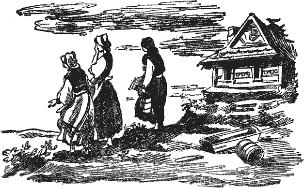 Пошла старшая в город огня добывать, а младшие обе крепко ей наказали скорей возвращаться, потому – больно есть хочется: целый день ничего не ели, а уже солнце садится. Стали они ее ждать. Ждали дотемна, а ее все нет. Видно, заблудилась, потому что жили они и лесу. Хотели они обе пойти на розыски; да нельзя дом бросить. И пошла средняя, а самая младшая осталась тесто месить, чтобы к их приходу все готово было. Перемесила она тесто, посидела, отдохнула, а тех все нет. Стали страх и голод ее мучить; что делать – не знает. Подумала и сама собралась пропавших искать. На дорогу испекла себе из поскребышков три хлебца прямо на уголечках, что еще горячие были. «Найду их обеих, – думает, – вместе съедим».