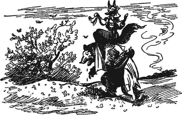 Услыхал медведь, что лиса эту насмешку без конца твердит, рассердился, скинул ее на землю и хотел хорошенько проучить. Но лиса была проворней: она убежала в нору под деревом и стала оттуда над медведем смеяться. Тот еще больше рассердился, выбрал большую корягу с закорючиной и стал той корягой лису из норы вытаскивать. Зацепил ее за ногу, а она и говорит: