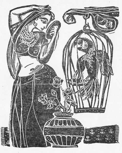 И когда она, выслушав эти слова попугая и снедаемая любопытством, осталась дома, попугай начал рассказ.
