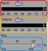 Красная область (Input) – громкость звука до Mastering Rack. Желтая (Output) громкость звука после прохождения всех эффектов Mastering Rack. Синяя – количество «сухого» (не обработанного эффектами звука) и обработанного, значение 0 выключает эффекты.