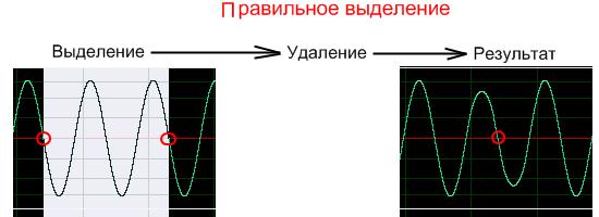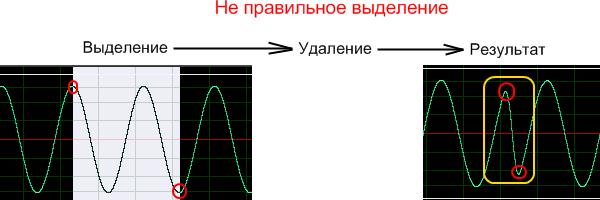 При удалении участка звука в нем могут появится щелчки, это произойдет по причине не правильной нарезки (удаления части звука). Для примера посмотрите на картинку ниже. Если вы неправильно выделите участок то появится щелчок: