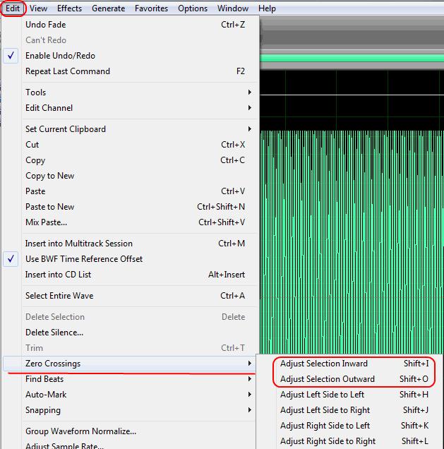Если вам лень делать правильное выделение в ручную, то в Adobe Audition для этого есть специальные опции. Попробуйте неправильно выделить участок и воспользоваться ими: